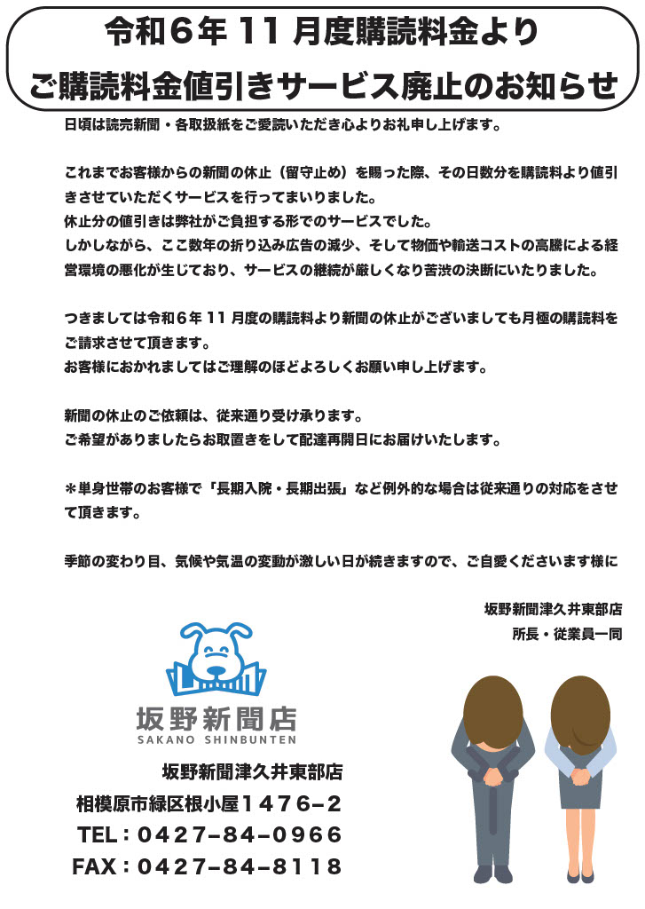 11月から新聞休読による購読料の値引きを廃止させていただきます。